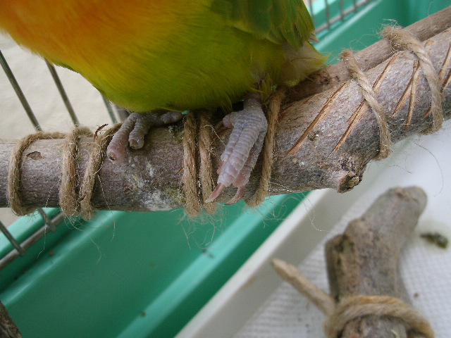 前側に指が三本揃ってしまって指が動かない。掴む動作がない。掴めないので止まり木に乗っかっても安定しないのよね、乗っかるのがやっとかな~。