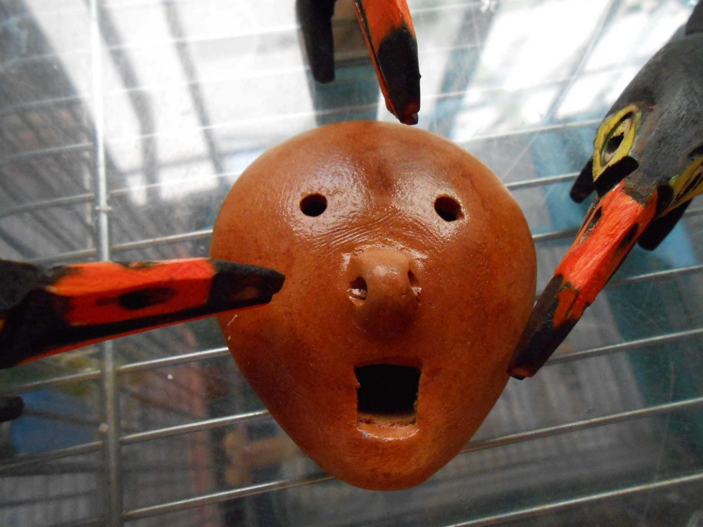 )この人面笛はですね、目を隠すと!目と目の下側にある穴をふさぐとちゃんと笛になるんですよ!