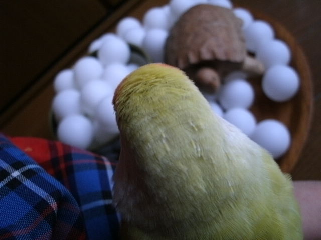 鳥さんによっては1個入れただけでしつこくボールを追いまわしています(まるこさんですけど~)、まめちゃんはピンポン玉にクチバシのとっかかるところがなく投げ飛ばせないのでもっぱらタックルして忙しいようです。
