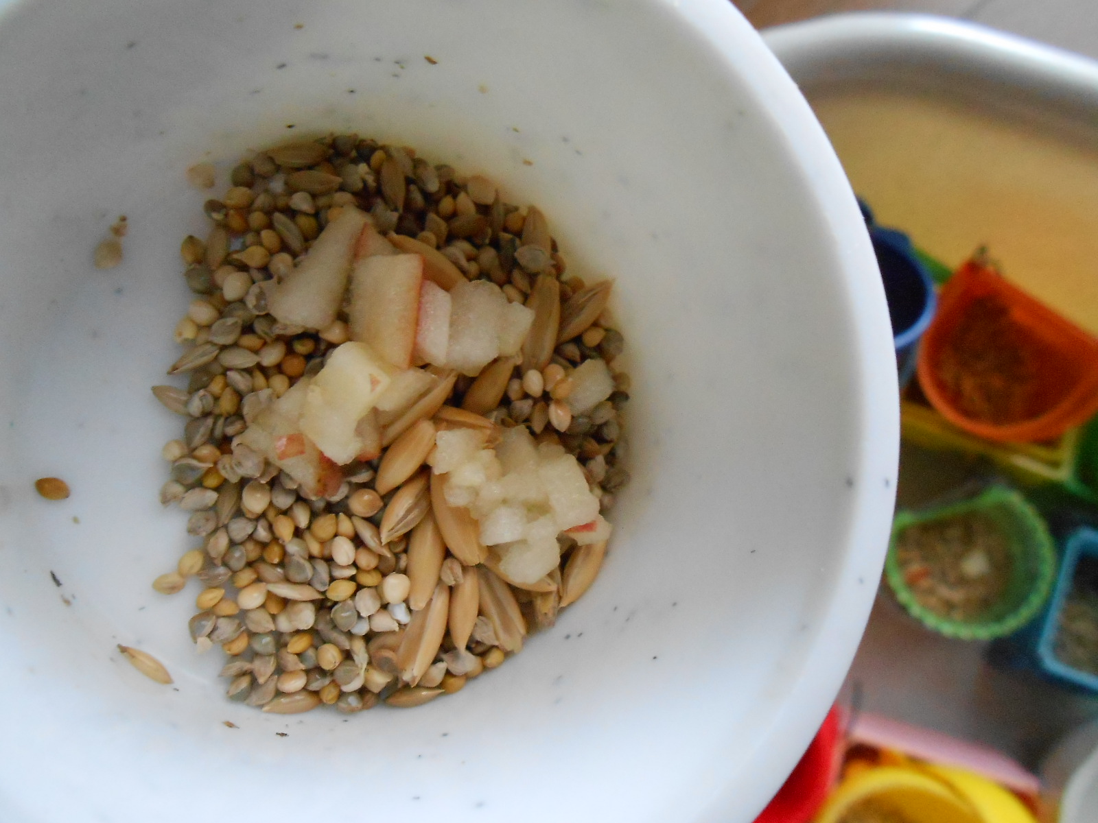 で、結局鳥さんも一度にはそんなに食べ切れませんので、残った乾燥おリンゴやニンジンはハサミで細かくチョキチョキして
