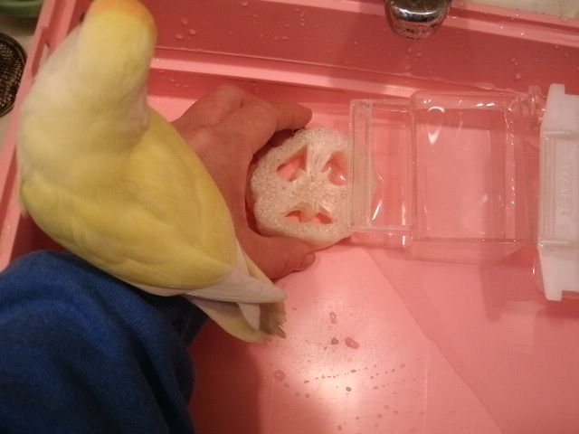 鳥さんたちのご飯いれなんかをキレイにしてやってください!がんばって!!