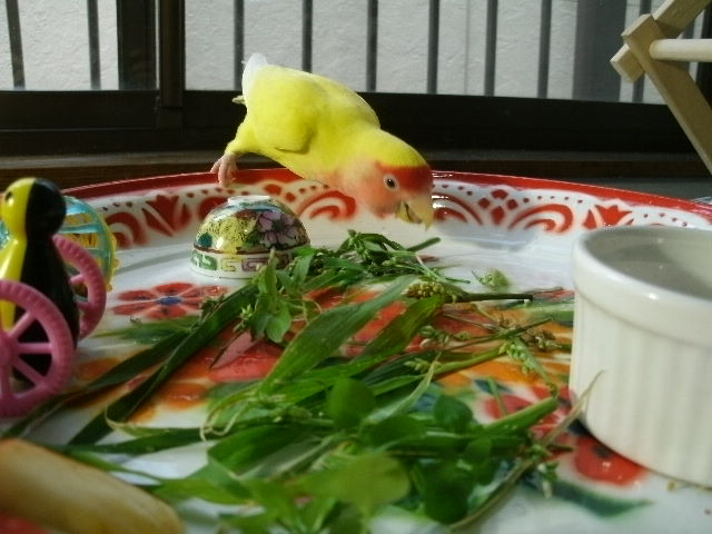 せまっこい日陰のプランターでもホモのってくれましたので、スズメさんに味見される前に我が鳥さんへ!!