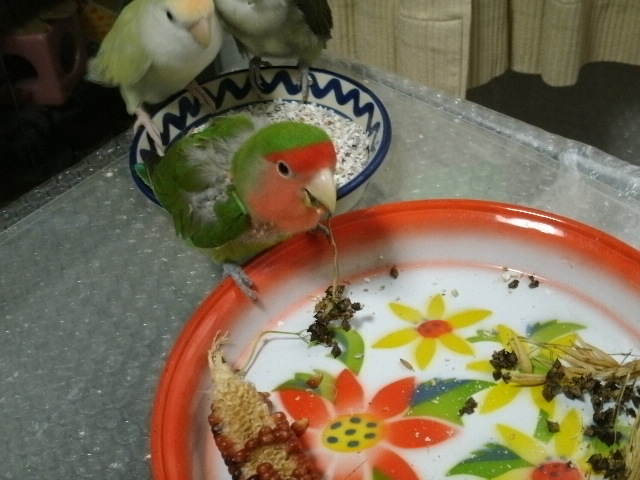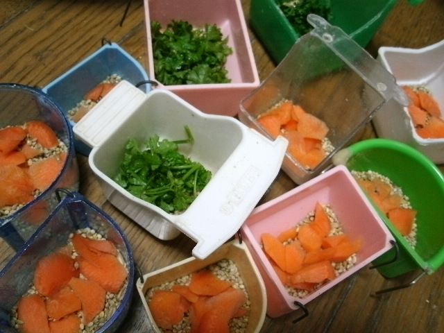 パセリとかニンジンお好きじゃない鳥さん多いので、わざと多くのっけて食べるのじゃましてるのでほじくるのに少し時間がかかればお食事時間が長くなっていいじゃないですかーー(たぶん)。