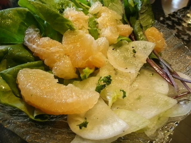 島根から届いたみずみずしいお大根とグレープフルーツの皿だ。いや、サラダ