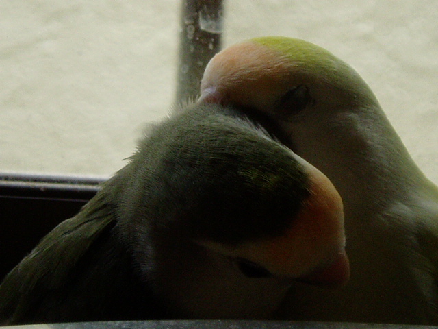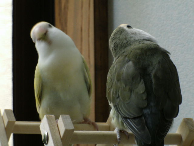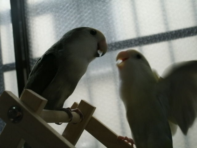 このお二人、大人インコさんだけあって静か~に、しっと~りお話なさってるんですよ。おばさんが素敵なボサノバミュージックでも用意しましょうか・・・・の必要があるのかないのか、外野が騒がしいわね