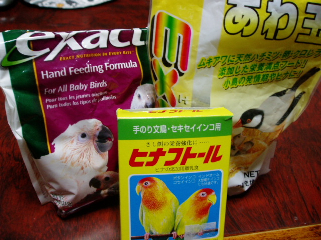 このパッケージについ手を伸ばしてしまいました。ヒナの添加用離乳食とありまして、栄養価抜群のスピルリナ配合。挿し餌のあわ玉に混ぜるほか親鳥の発情飼料の栄養強化・・・となっております。我が家では小松菜、フォーミュラー、あわ玉を使用してましたが今回よりヒナフトールも登場!味はフォーミュラーと似ていますが(チーズっぽいような)、フォーミュラーはじゃりじゃりと歯ごたえ?があるのに対しヒナフトールはなめらかです。そうです、私は自らテスターしますよ~アホですね。どっちが好まれるかと言うと・・・わかりません。でもチビッコは確実にフトールです。