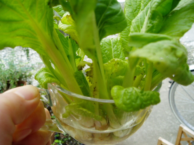 小松菜さんの残骸を捨てずにこーやって水に挿して置きますの