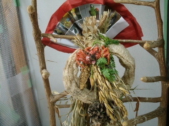 鳥さんの飾りのついた注連飾りはさ~、束ねるだけですから時間はかかりませんけども、栽培するところから数えるとそうねぇ~、一年がかりかしらー?