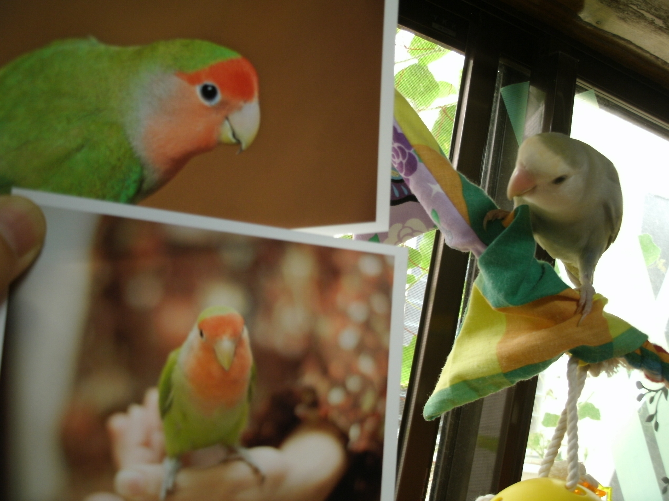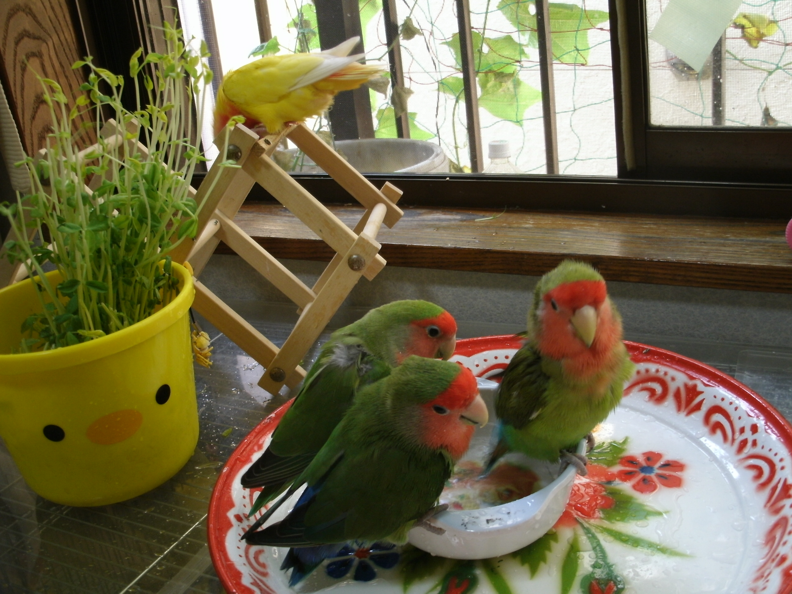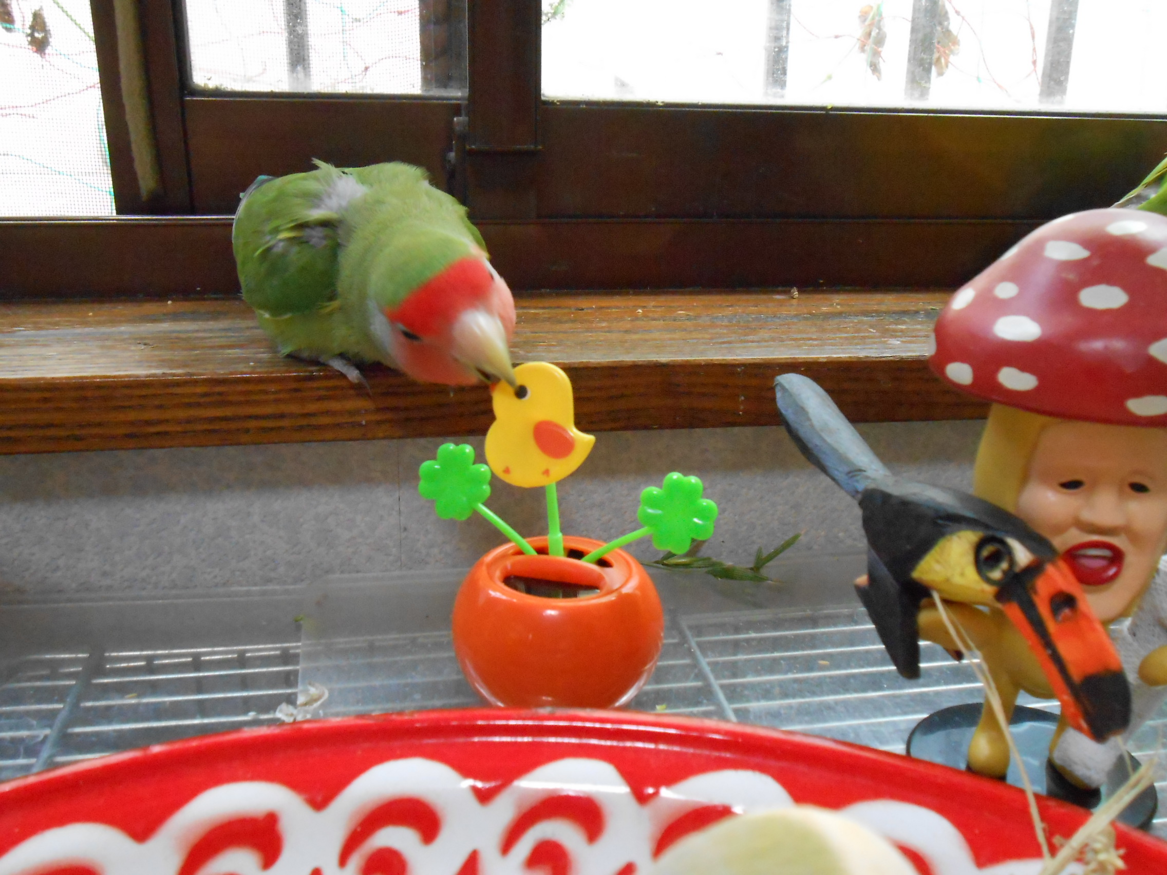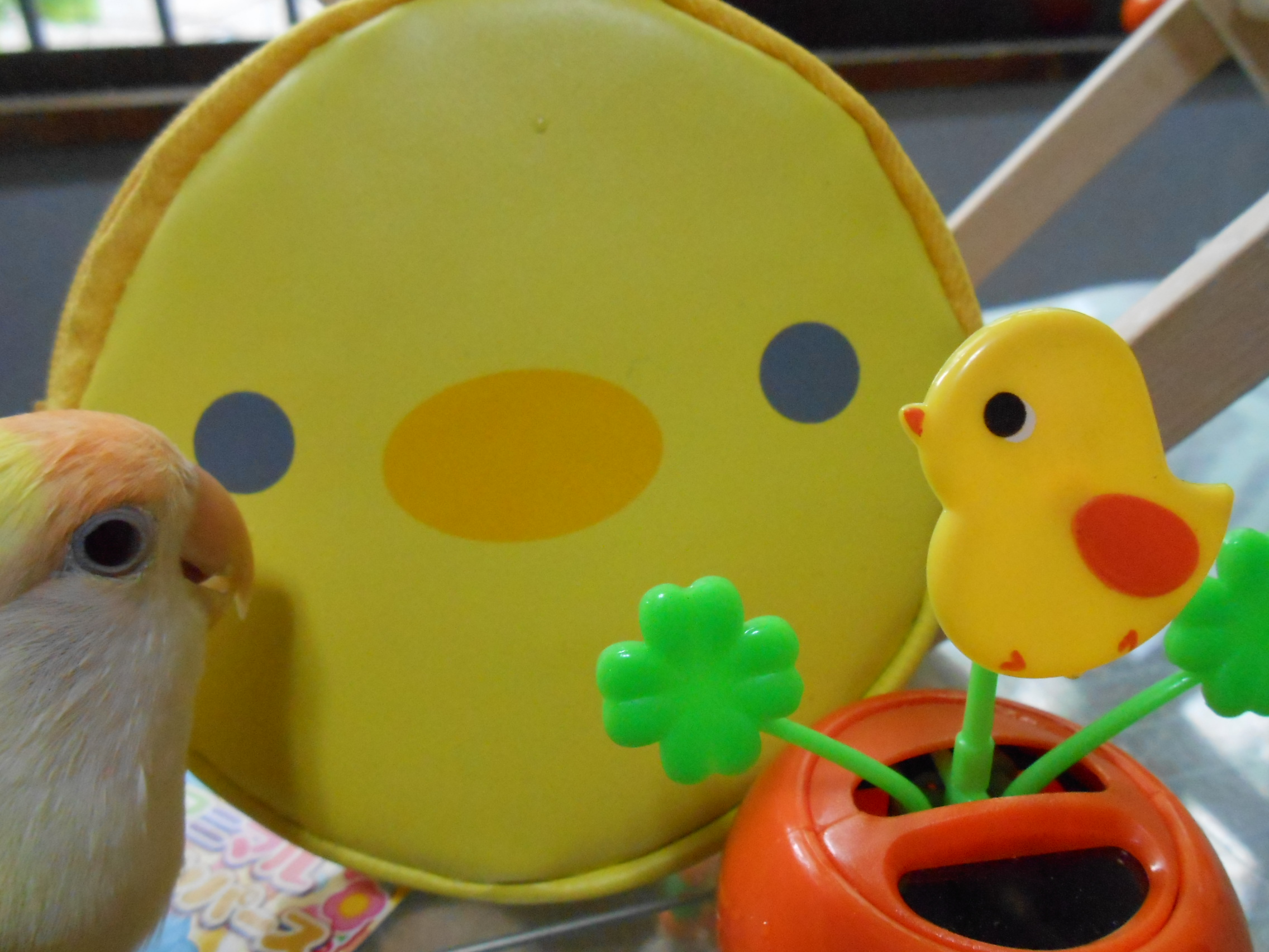先の画像にありました鳥さんグッズのクローバーと黄色い鳥さんは太陽電池(?) 日に当てるとゆらゆら動くグッズでございまして、鳥さん部屋に置いておきますとゆらゆらと動いて