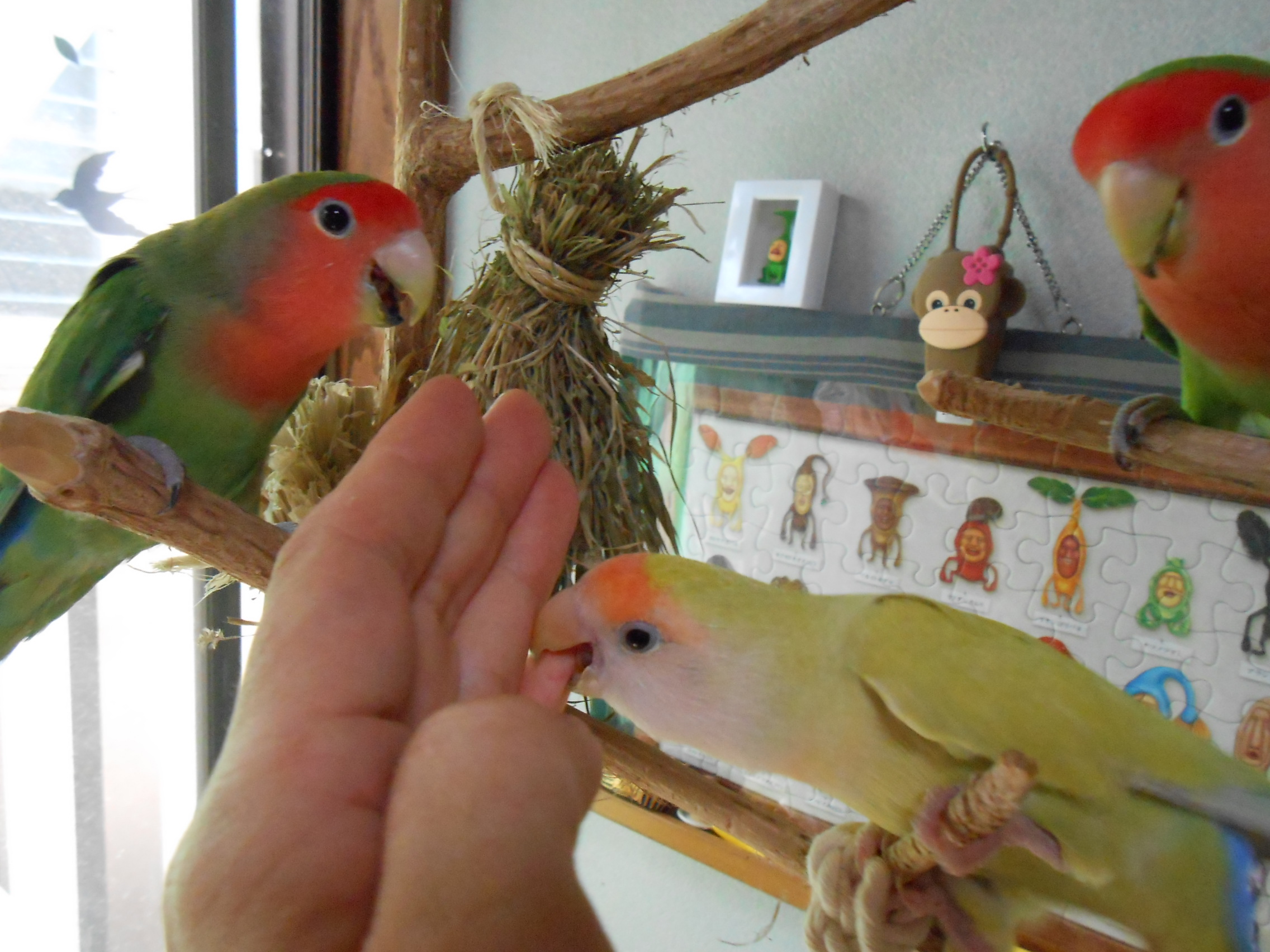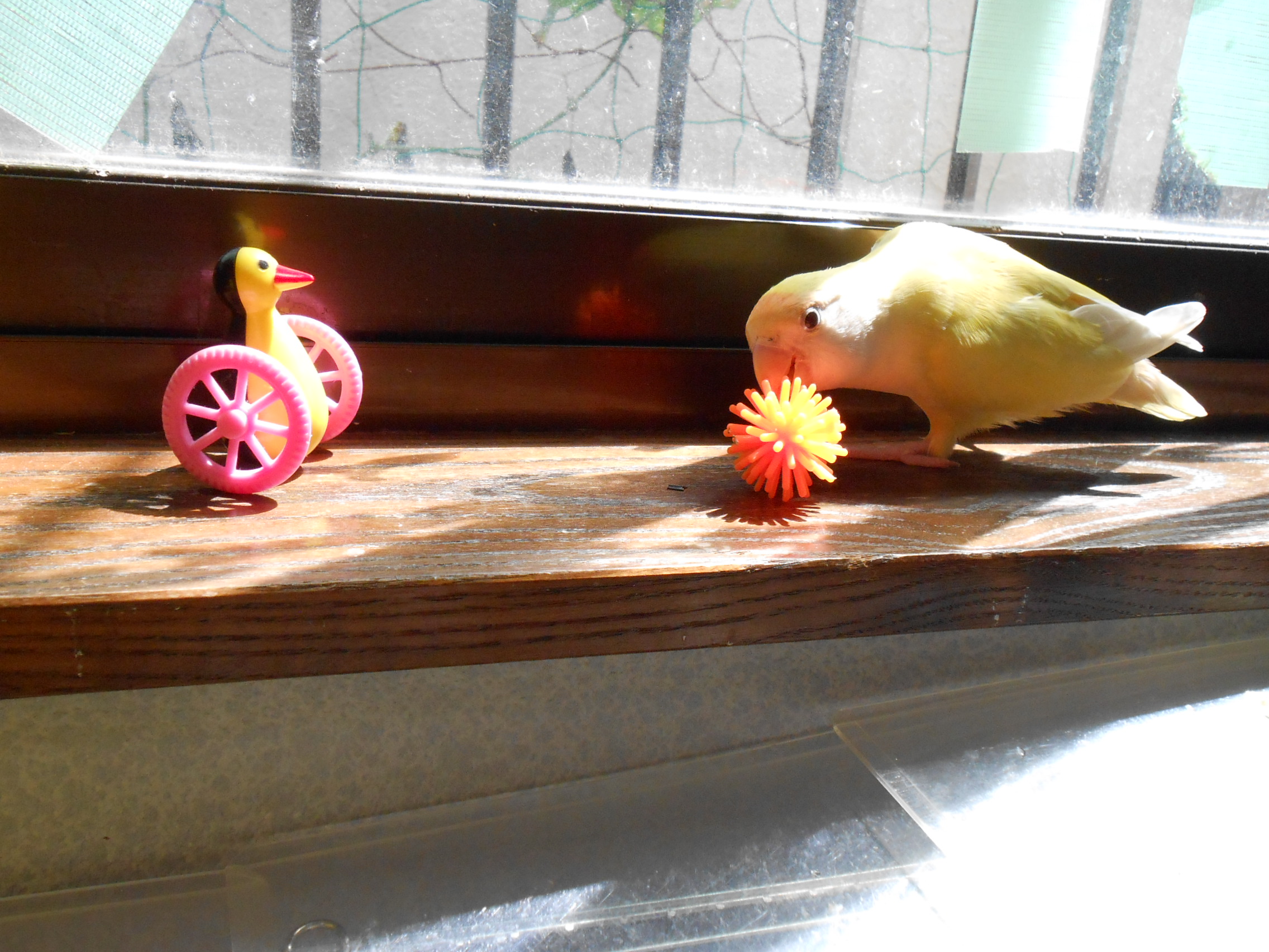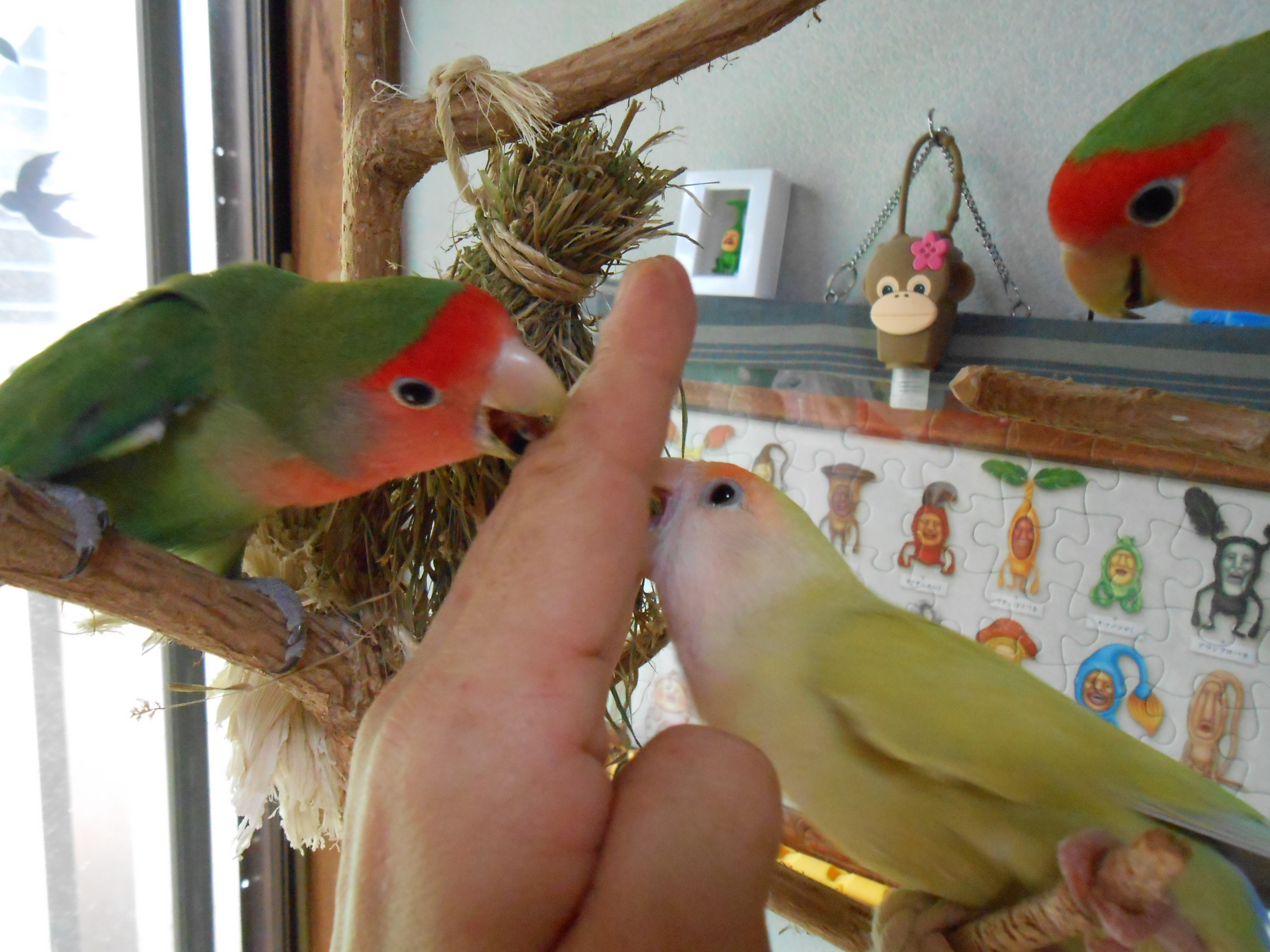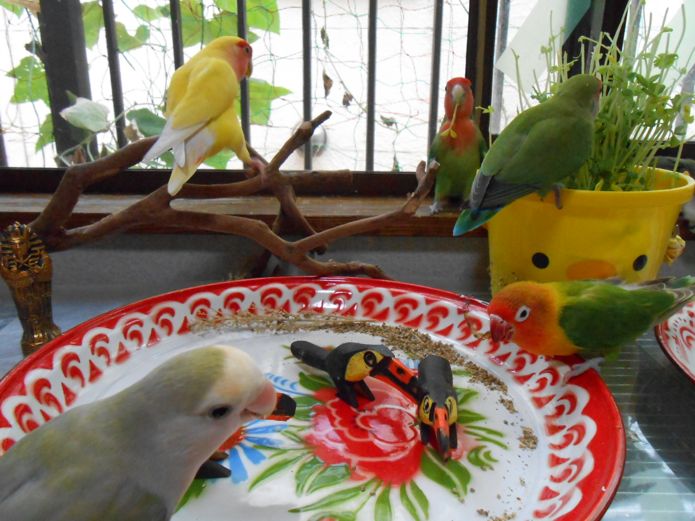 先の画像にありました鳥さんグッズのクローバーと黄色い鳥さんは太陽電池(?) 日に当てるとゆらゆら動くグッズでございまして、鳥さん部屋に置いておきますとゆらゆらと動いて