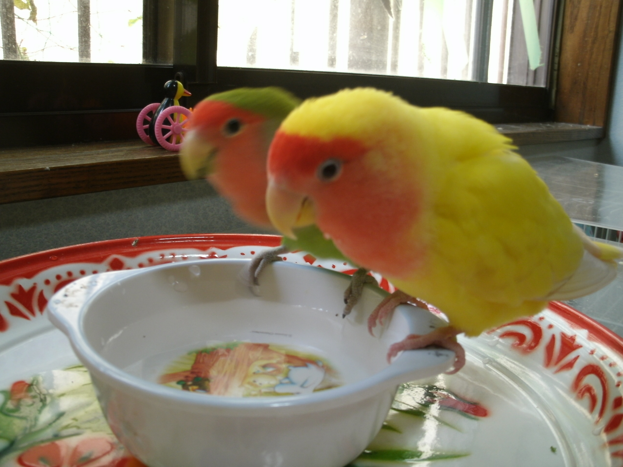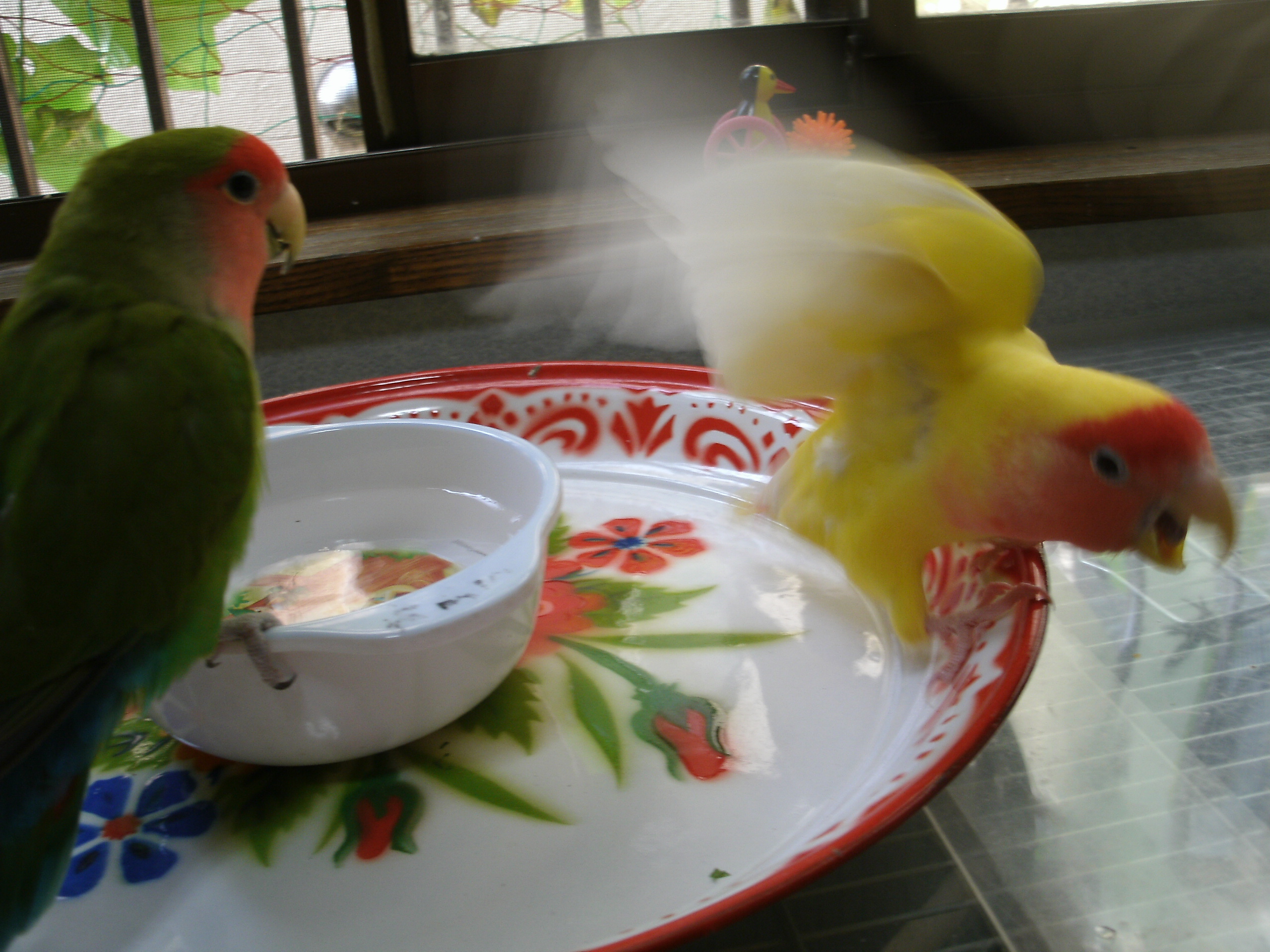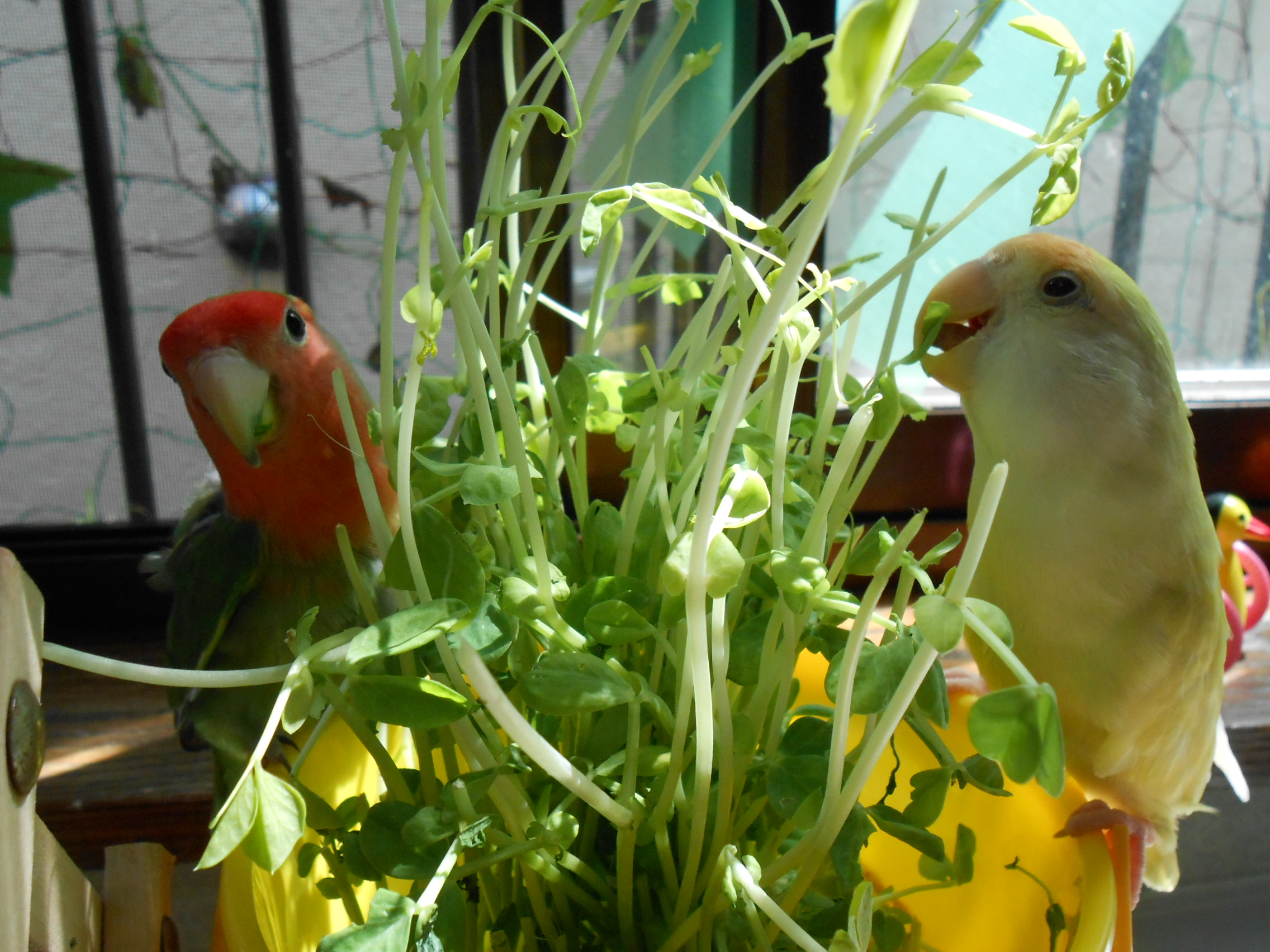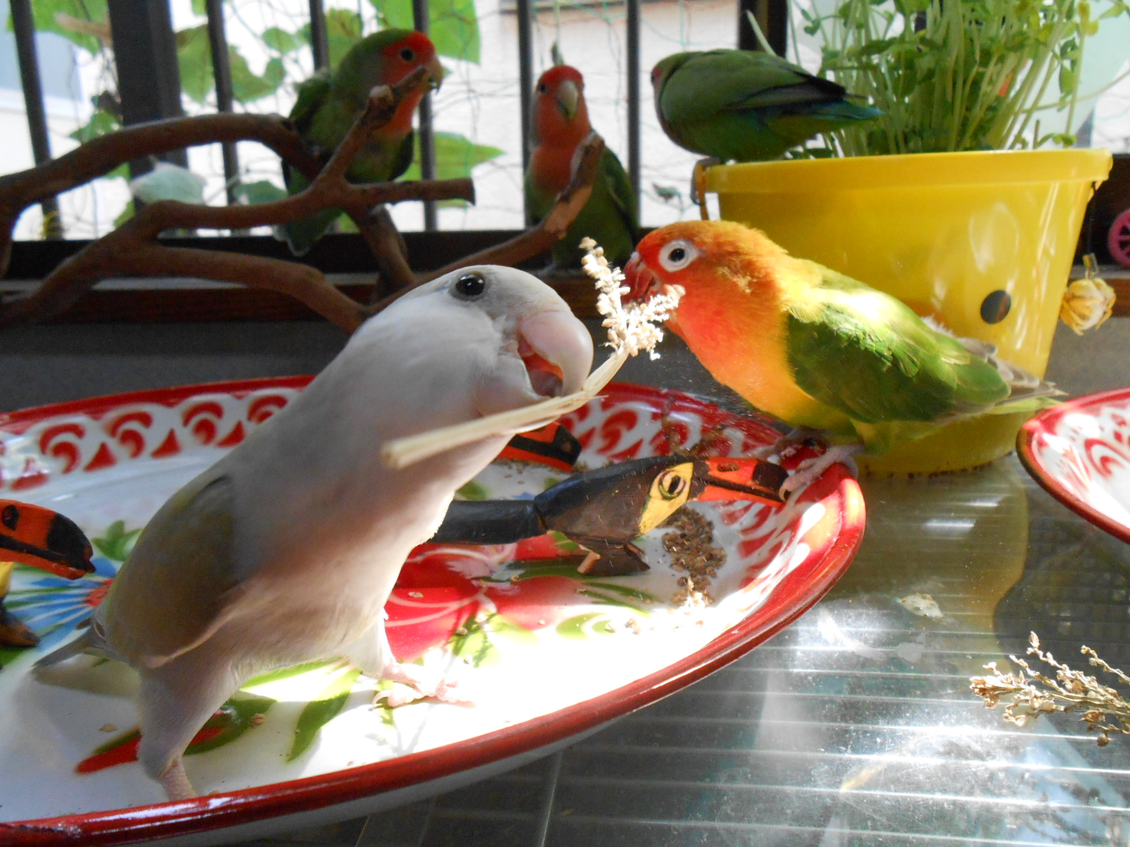 先の画像にありました鳥さんグッズのクローバーと黄色い鳥さんは太陽電池(?) 日に当てるとゆらゆら動くグッズでございまして、鳥さん部屋に置いておきますとゆらゆらと動いて