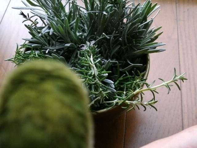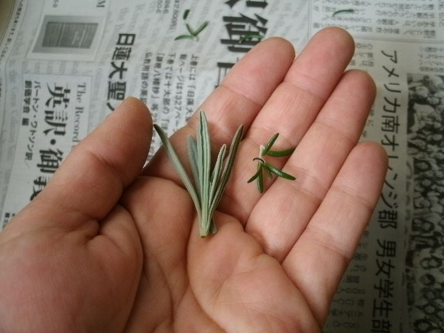 ラベンダーの抽出液はつぼみ(?)のあたりのお花から採るようですが、葉っぱだって相当香りがしますもの。ラベンダーの茎切って、ついでにローズマリーの茎切ってみた。すごい香りがしますわ、天然アロマ。