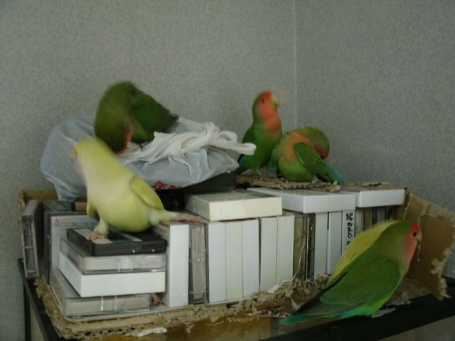 おばぁのカラオケ練習用テープが入ってる箱に群がる鳥さんたち