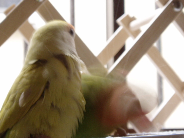 以前にもチロッと愚痴りました毛引きっ子のぴーちゃんですが、その時点では毛引きの処置もあんまり気が進まなくて、病院の先生にクチバシのカットを進められたにもかかわらず‘も~おちょっと様子見たいんですけどぉ~・・・’と曲がった親心でのらりくらりとしてきたわけですが、肝心なぴーちゃんはといいますと、毛引きが治まったり、かと思うとまた引いたりの行ったり来たりでして本鳥が元気なもんだから長い目で・・・なんて思ってましたら、どうにも飛行距離がずいぶんと落ちまして‘ほ~ら、そんなに抜いちゃうと飛べなくなるぞ~’とのんきに脅しまして羽をペロッっとめくりますとニキビ粒くらいの水疱といおうか膿胞といおうか見えましてね、やな予感・・・チョイチョイと消毒しておいたんですが翌日の朝は ガビ~ン!わき腹いっぱいに膿胞広がる~!!!人間で言う『とびひ』状態でございました。