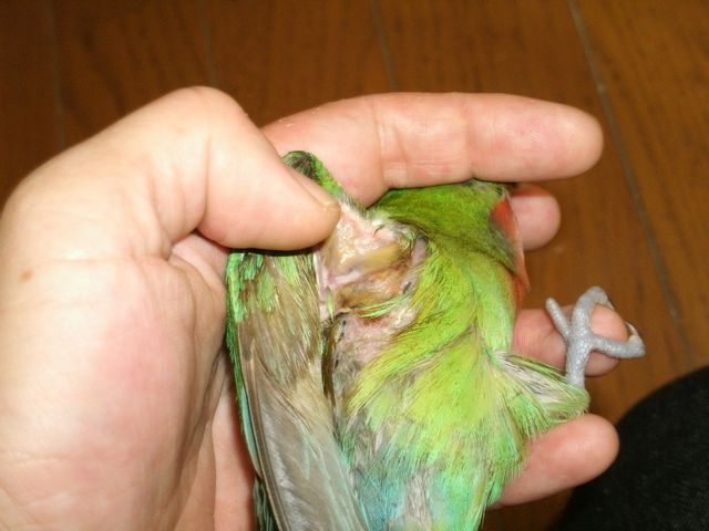 ぴーちゃんの毛引きは羽を閉じた状態での羽の下の脇から背中にかけて抜くのがお好みな様ですので、抜け具合はわかりづらいと思いますが、抜いたり噛んだり(噛んだっつっても出血痕はなかったんですのよ)から皮膚がずいぶん感染してしまいましたので、グロいですけどお写真公開しますので ‘可哀想’と感じた方は今のうちにページを閉じちゃってくださいませ。参考になる、ならないは別としても一応見ておきたいという方は続いてご覧くださいませ。