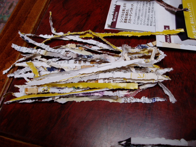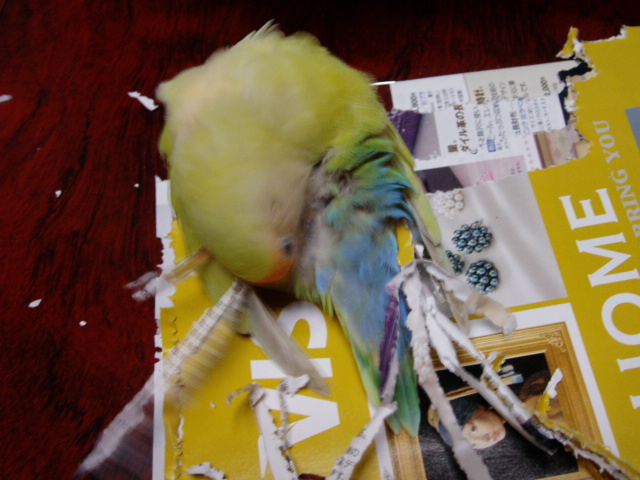 女子インコの発情には困ったもんだと思いながらもまったくケージから出さないのも可哀想ですし、紙を全部取り上げてしまうとビニールクロスなどをかじり始め誤飲されるのも困るので、10分間だけ紙切りを許してます。