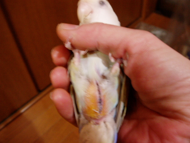また一緒になれてよかったね、と私の目頭は熱くなるのでした。みるくさんはしばらく投薬と通院が続きそうです。一週間後くらいからホルモン剤も投薬予定だそうです。ホルモン剤をはじめるまでは一日三回の投薬が必要でして・・・・さてと、ここに非常識を超越した小鳥バカが、バカが進化します!と言う宣言をしてみる。普通にお勤めしている方が聞いたら(私も普通に勤めてるつもりなんですけどね)びっくりするか、呆れるかのどちらかだと思いますが、明日から小鳥さんと一緒に仕事に行こうじゃないかってたくらんでます。許されるもされないも、我がままとアホはつける薬なしってことで、だーちゃんとみるくさんを連れて行きます。これで投薬回数も問題なくケアできそうですね。と、こんな非常識を押し通そうと決めたのはみるくさんの術後の姿・・・気の弱い方や生き物の傷を見たくない方はこの先読まないで下さいね。こんなに気の毒な傷跡がつきました。
