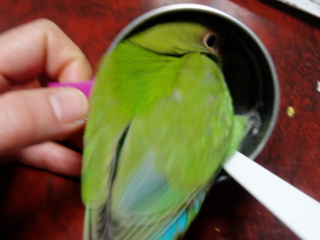 このお年頃の子インコの行動はよくわからないことも多くありまして、挿し餌をたらふく食べてもういらないのイヤイヤをしてるのに鳴き声はおねだりのギャーギャーでずっと騒いでる上にぐるぐる回りつづけてる・・・