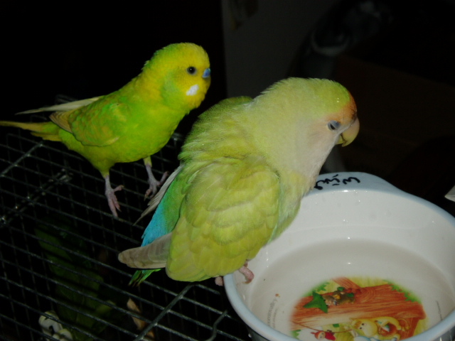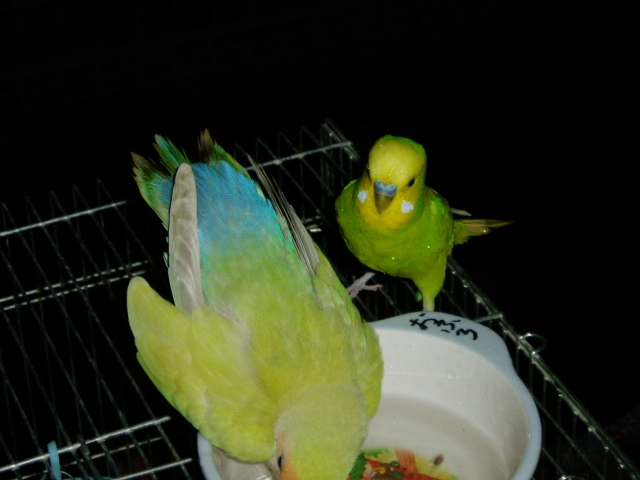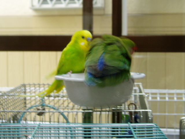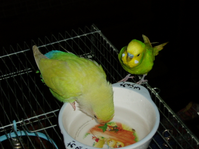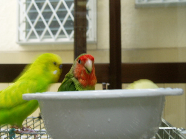 セキセイインコのタケちゃんは、どーしてもコザクラさんと混浴したいらしい。