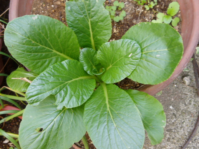まぁ心の広いナイスなおばさんですから怒りませんよ。だってね、こんな撃ち落とされたお気の毒な小松菜さんたち(株元がしっかりしてるところ)を水を入れたコップに立てておいたら根が伸びてきて、植木鉢の隅っこに植えてみたら、立派になったじゃございませんか。種から育てるより断然成長が早い!