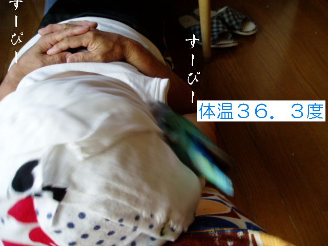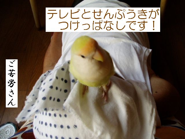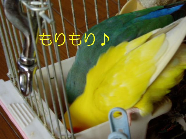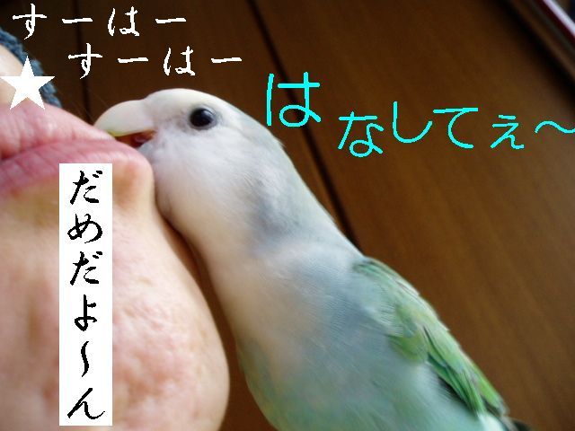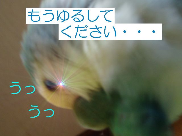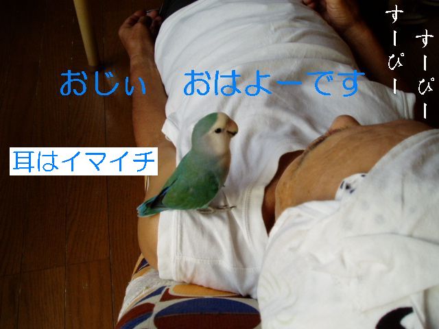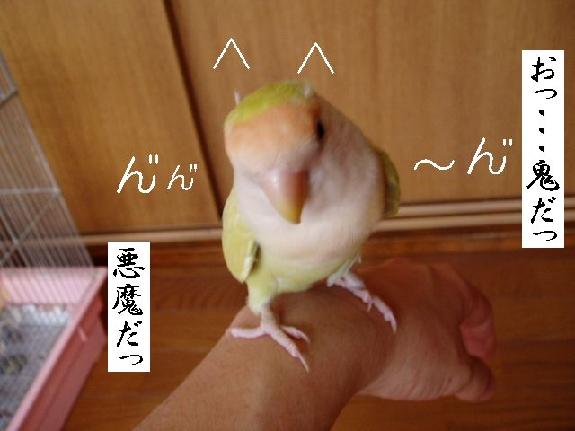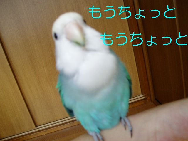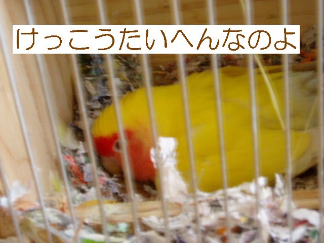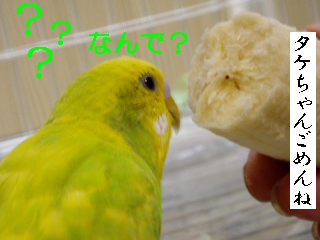 朝のタケちゃんのお楽しみは、おばぁのまわりで一人遊びするのが日課でおばぁはタケちゃんに強制的に歌のレッスン?したり、テレビみたり、お茶飲んでたり・・・タケちゃんは他の子のケージの上にすぐのっちゃうのでお遊び中は他の子のケージの上にクリアーのビニールクロスのっけてたんですが・・・・あー、ごーめーんー。 何羽も小鳥さんがいるとちょっとしたケガや出血にゃー驚きませんが、今朝はまいった、ビビッた。なんせちっこいタケちゃんの細っこい足が咬まれるなんて、というよりどっから血がでてるのかわかんないぐらい多量出血してお腹あたりが血まみれでクロスの上からケージの中からテーブルの上まで血だらけで、自分でこんなにたくさん血が出たケガなんてないよな?ってぐらいの出血量がちっこいタケちゃんから・・・あわてながら冷静にまず消毒、次は止血、でも傷口どこ?やさしく血だらけのタケちゃんを拭くと、ん?あしゆびにちょこっと傷(たぶん咬まれた)らしきもの、こ、こんなちょこっと傷からあんな大出血? とにかく悪いのはこのおばさんとおばぁだもんね、目を離したことに反省。 タケちゃんですか?・・・もしかしたらですけど、ケガをしたことに気づいてないかもしれない、そんな様子なんですが。血の気が多かった?