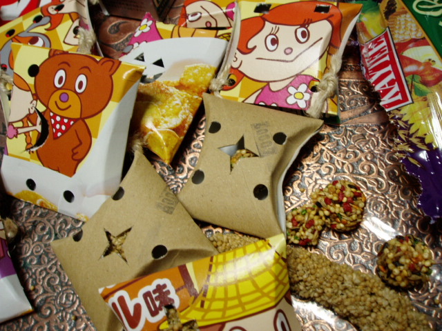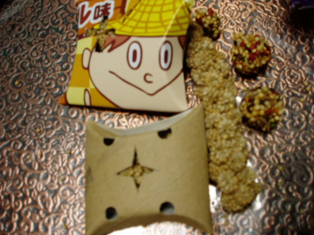 コチラの箱には普段食べている(いや、たまにあげてる)おやつを詰めて完成です。某KTの商品でこんなカンジのがあったのでまたまたコピー。遊びながらほじって食べるおやつですね、シードのボールになったやつとか粟穂とかひまわりの種を一日分だけ詰めてみました。コザクラインコさんの破壊頻度は相当なので、我が家は数多いし・・・最近のおもちゃはこういう材料費のかからないものが多く登場しますね、ダンボール切って束ねてぶら下げたヤツとか角材の切れ端ころがしたりぶら下げたり・・・ちょっと生活の厳しい家庭のお母さんが知恵と愛情で作ったおもちゃ風で見た目はイマイチだけど実用性はOK・・・・みたいな、ですね。