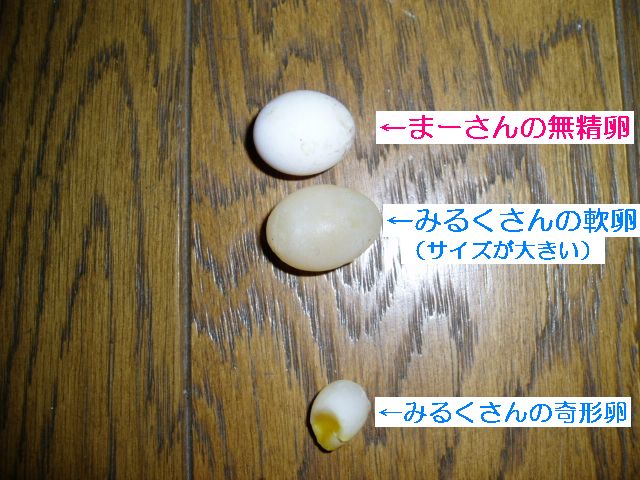 軟卵は殻がペコペコしてて、少し透き通ったカンジわかりますか?まーさんのたまご(無精卵でしたが)が平均的サイズ(我が家では)なんですが・・・お腹で割れなくて良かったー、こわかったです。