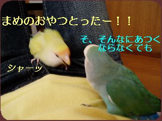 「シャーッ、まめのおやつ とったでしょー!!!」