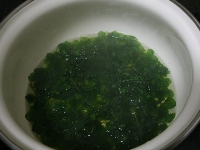 お鍋にお水を・・・勝手にカップ一杯と(200CC)と決め込みまして、乾燥したハコベを入れてゆっくり煎じてみましたー(弱火で15分くらいやってたーー)