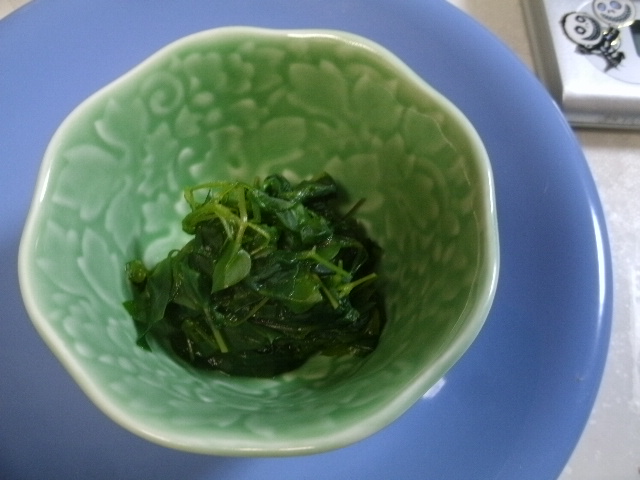 変わったニオイとか味はないのでフツーに美味しいおひたしだ!けっこう歯ごたえあるんじゃないですかね?茎のあたりの繊維かな。