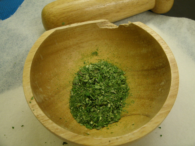パリパリに乾燥した葉っぱを乳鉢またはすり鉢なんぞでゴリゴリすると、さて何になるのでしょうかーー??