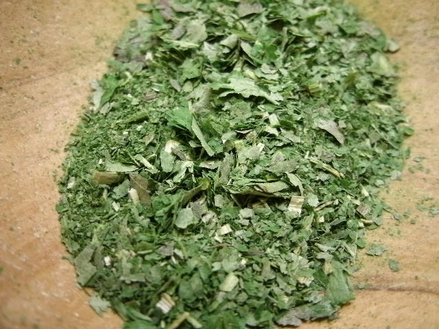 使った葉っぱはタンポポ、パセリ、オオバコ、ラベンダー、レモングラス、ミントの家に生えてる草でして、これらを一夜干しにするとしなっこくなりますんでそれをレンジで1分くらいチン・ω・♪しますとパリパリに乾燥しますーーー