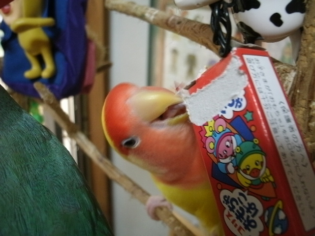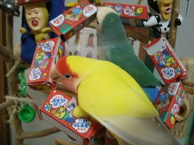 箱の中におやついれたり、鈴入れたりすると鳥さんおおはしゃぎで飛びつきますよっ!
