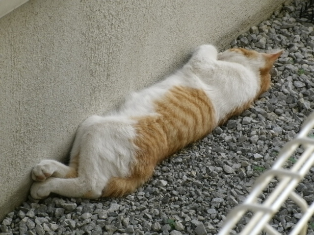 やだ~、急にぐったりしちゃってー。植物も人間も同じように夏バテっちゃうのかしらー・・・と思ってましたら、今朝ほどぐったりプランターの横でぐったりしてる方を発見しましてー