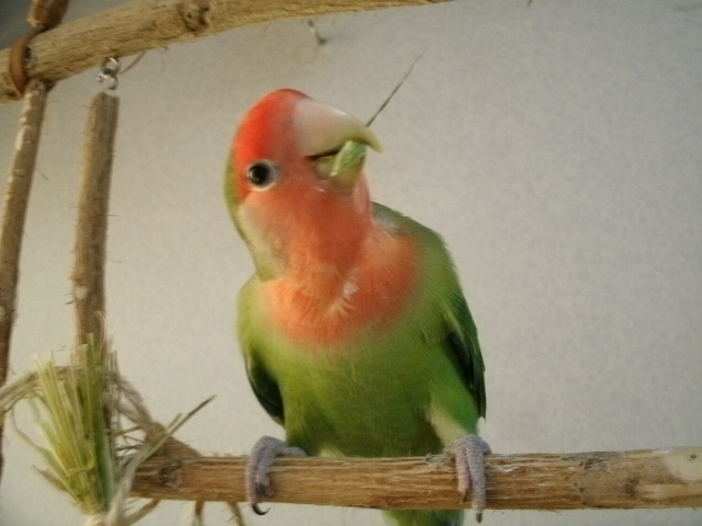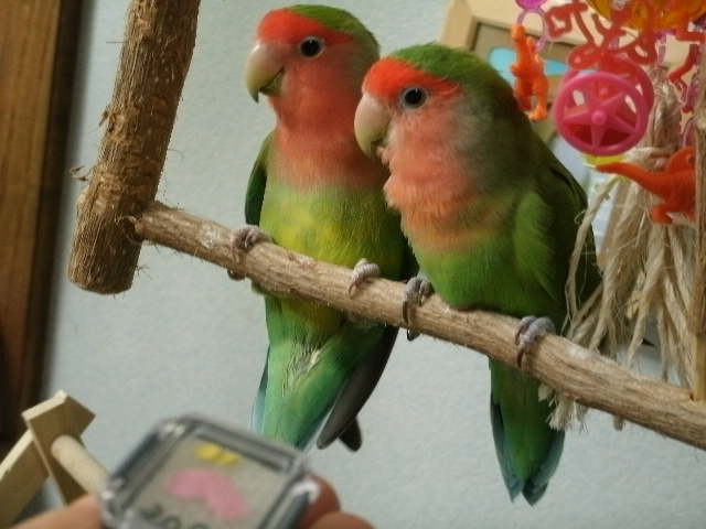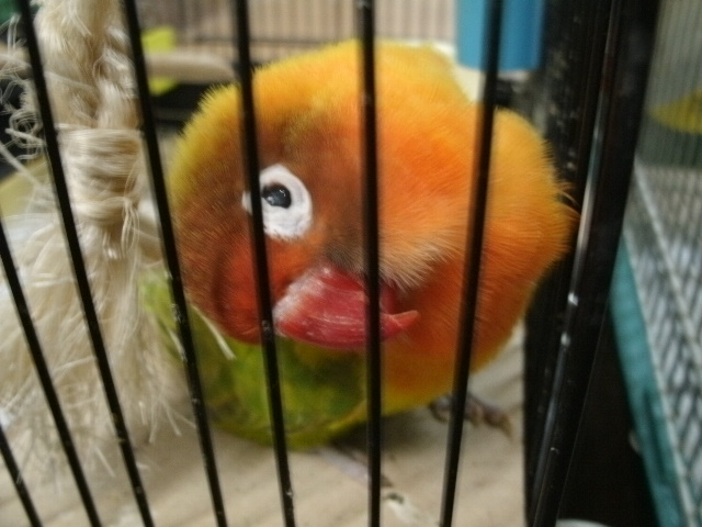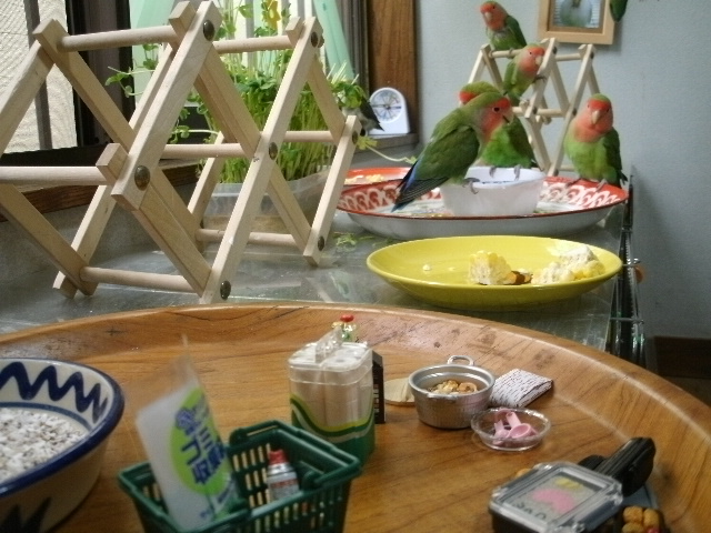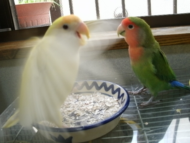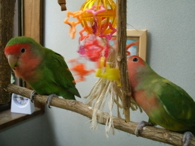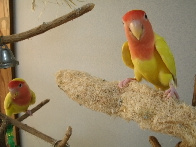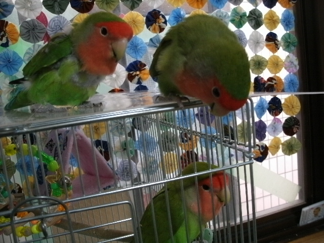 まだまだ2羽同居させとくつもりですけど、そろそろおすぎちゃんをあまり高いところに登らせないほうがよいかも・・・と思い始めましてーー(ド突かれて落っこちたりあるんで)。