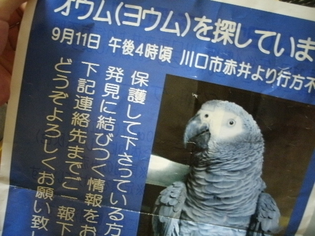 職場近辺で迷子になったって事でチラシは職場の待合室の目立つところに貼り、自分がワンコ散歩に出るときは上向いて散歩したりしてましたけど、今頃どうしてるんだかケリー君(チラシに載ってたヨウムさんのお名前)・・・などとその後の情報はわからないままだったんですよねーー。