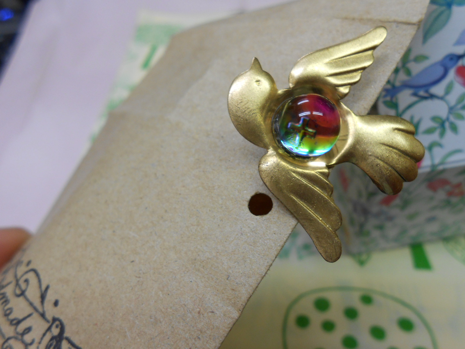 ゴールドの鳥さんフレームに虹色の玉がのってる可愛いピン・・・とじーーっと見てましたら、虹色の玉の底に十字架見えてビックリ