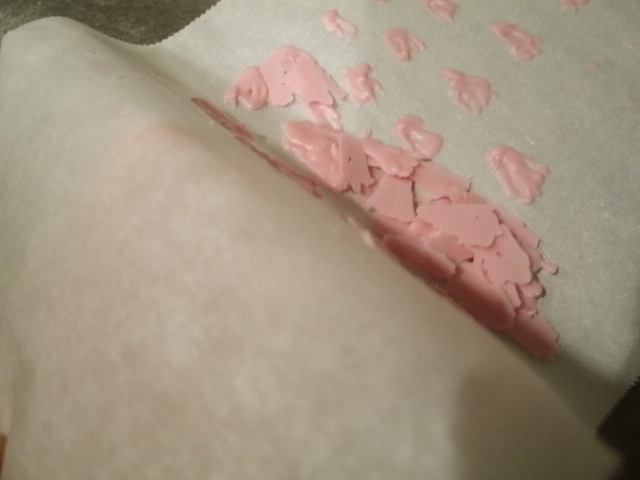 クッキングシートの上にカーネーションの花びらをイメージして、ピンクのデコペンで大中小の花びらをテキトーに描いていきま~す(クッキングシートがなかったら牛乳パック広げて内側を利用してもいいかもねー)
