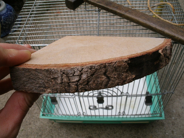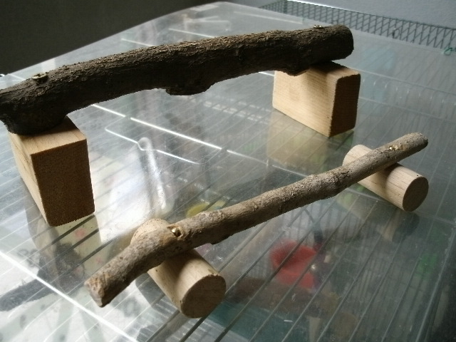 止まり木は布テープ巻くってのも考えましたが、それはどーしても木を掴めない時の処置として置いといて、片方のアンヨはまぁまぁ木を掴めそうだし、もう片方のアンヨは乗っけやすいように太いのと細い木を平行して止まり木にしてみましたーー。木には滑り止めとしていっぱい傷入れといた。