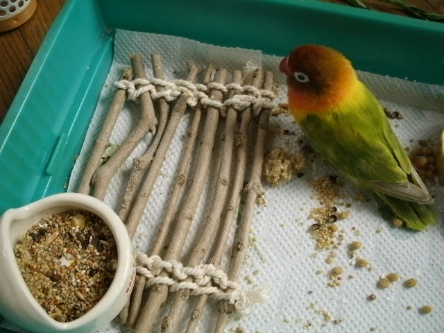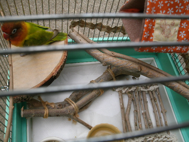 んで、ステージ取り付け、前に作った低い止まり木は・・・おっ倒して齧られてるだけになってしまったので、今度はもうちょっとワイルドな直置き止まり木を作りまして、低いところにも止まり木引っ掛けて仮レイアウトをしてみますと・・・なにっ