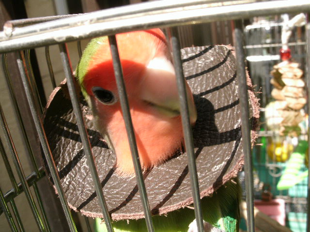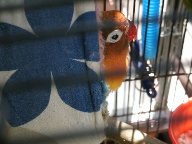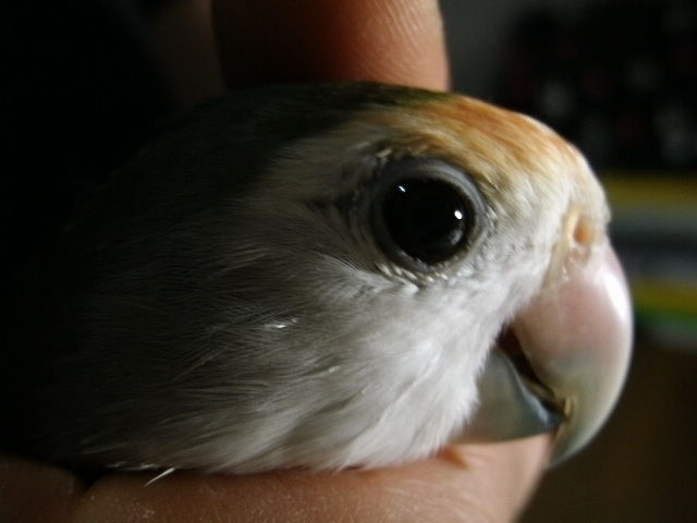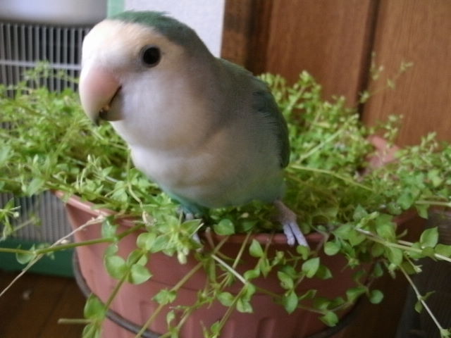 ボタンインコのおすぎさんの白内障はすっかり進んでしまい、両目の水晶体が真っ白白に濁ってるのでほとんど視力が無いと思われますが、太陽の熱なんかは体でわかると思うので
