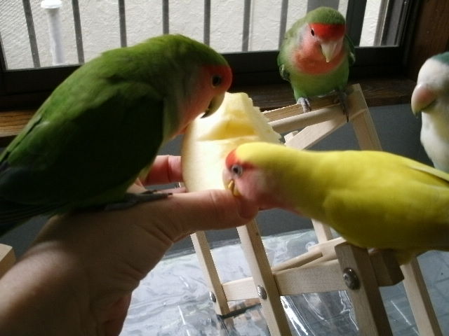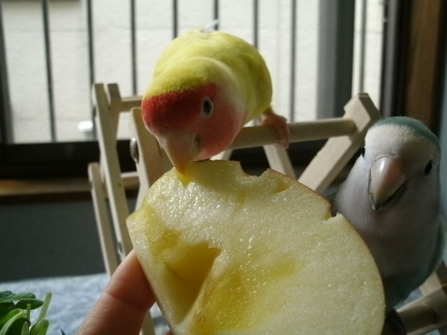 リンゴの箱には3種類くらいのリンゴを入れて送ってくださるんですが(赤と青リンゴと黄色リンゴ)、鳥さんの舌も贅沢よね~~。まるこさんは赤リンゴしか食べない。確かに赤リンゴが一番おいしかったりする。