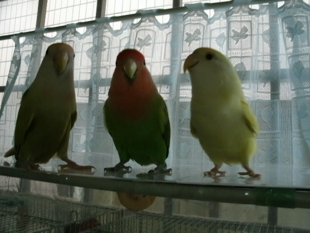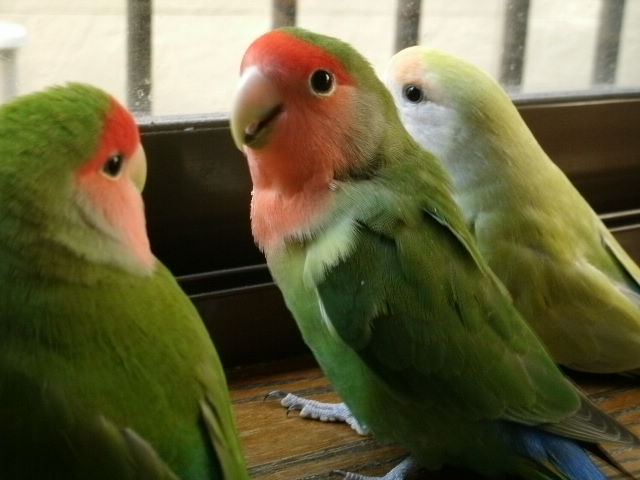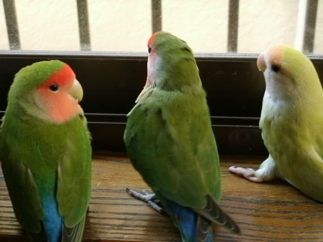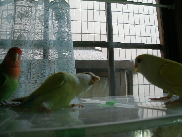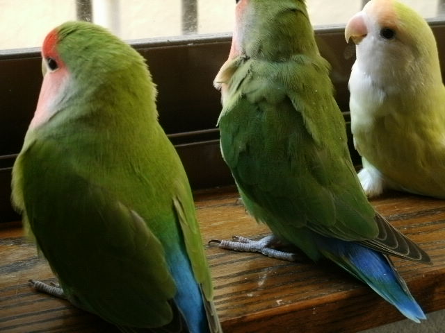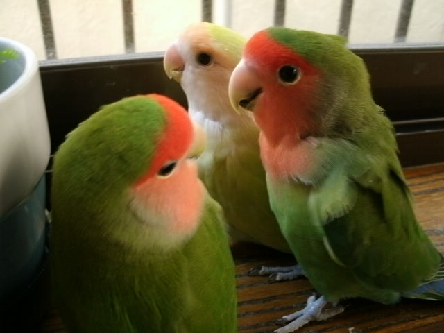 仲良しじゃないけど、なにやら3羽くっついて物思いにふけるげんき、ぴー、なっつ。