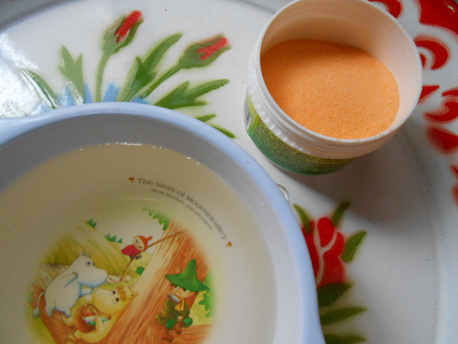 舐めてみるとしょっぱい(バスソルトですから~)、色はビタミン添加の色ですかね?