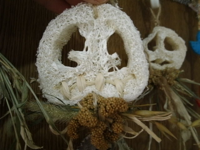 麻紐とヘチマとホモのと枯れ草(ウサギ草使いました)でこんだけできますよ~~。
