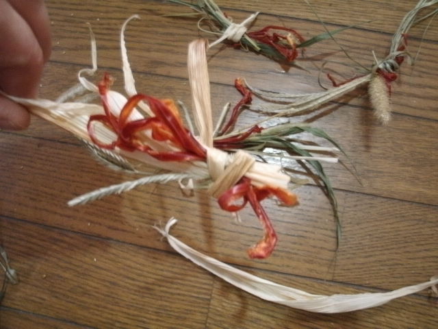 干草ピロピロとパプリカピロピロを適量ピロピロして束ねるだけですけど、こんな時にトウモロコシの皮ピロピロで束ねると束ねやすいです、ピロピロ♪