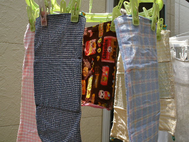 いっぺんに洗濯してしまったので替えのテントが足りなくなり、汗だくでテント作りに励むおばさん
