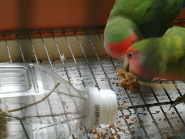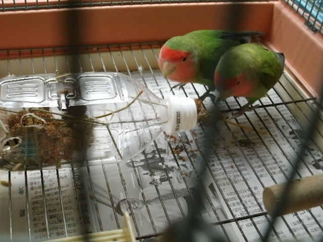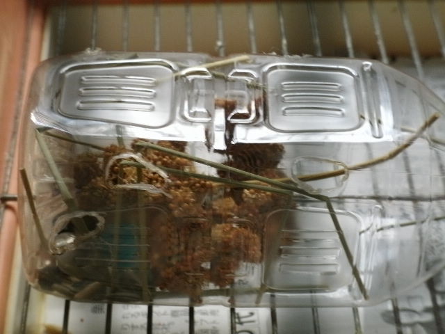 ので、と、と、と、とりあえず中身が丸見えのペットボトルに適当な穴開けて、粟穂さんやイグサさん、高脂肪のひまわりさんやら鈴、ビーズを入れて置いてみた。フタは無しでね~