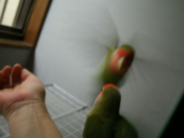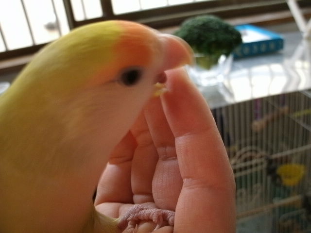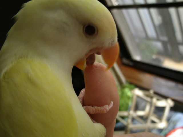 おばさんは愛鳥さんにかまれるのが習慣ですねー、ふが